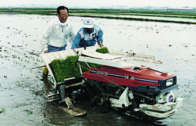 现代集团名誉主席郑周永正在用耕田机插秧。小时候的郑周永为了摆脱种田的宿命,离家出走了好几次。据说,取得大成功,成为大企业家的郑周永,经常把“想耕田种地啊”这句话挂在嘴上。