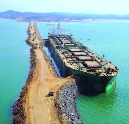 80年代初期,郑周永会长主导了瑞山围海造田工程,在西海浅水湾一带设置防波堤后,形成了人工淡水湖和田地。瑞山围海造田工程代表着郑周永会长永不放弃的挑战精神。
