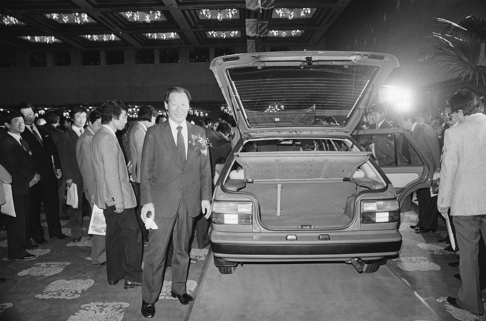 在新罗酒店举行的“小马(PONY)”新车发布会,郑周永留影。(1985年)
