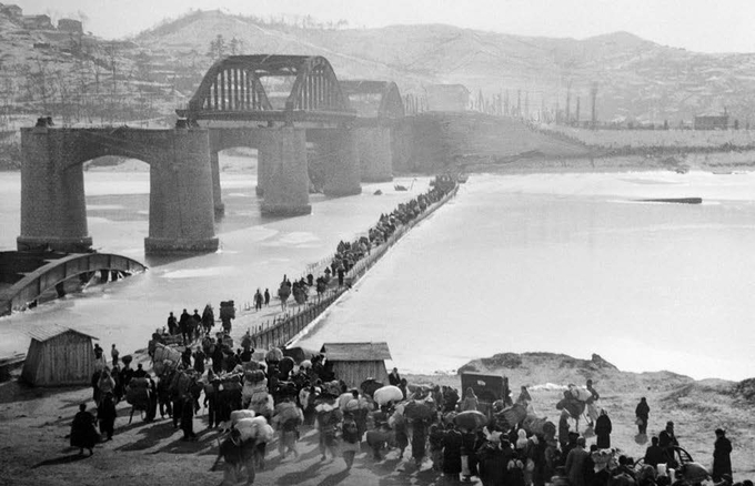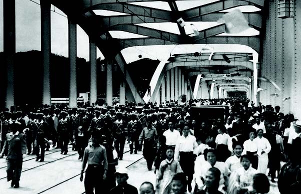 1950年,汉江人工桥被炸毁,难民正在通过浮桥过河。