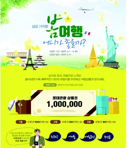 东和网上免税店以所有会员为对象,准备了旅游商品券赠送活动。从4月1日到4月30日,通过抽签的方式,给参加“推荐我自己的旅行地”活动的顾客赠送乐天观光商品券。1等奖为100万韩元(1名)、2等奖为50万韩元(2名)、3等奖为30万韩元(3名)。
