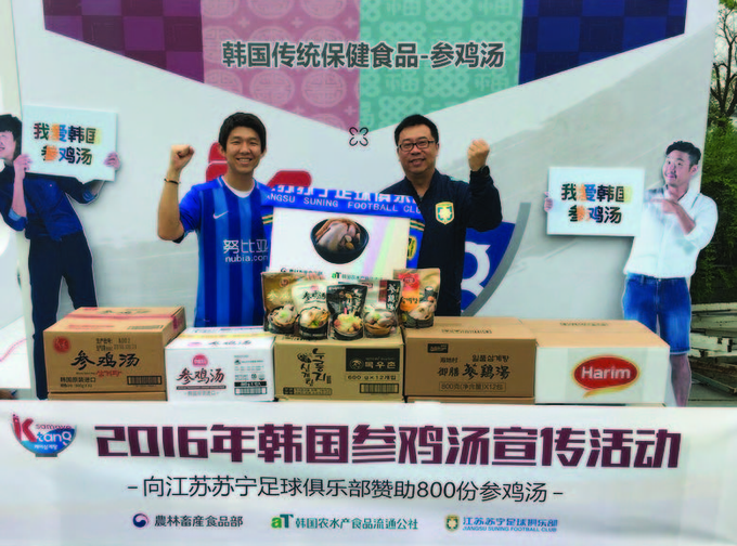国家代表队球员出身的崔龙洙为教练的江苏苏宁队进行宣传。得到了能够向中国2亿球迷宣传韩国滋补食品参鸡汤的机会。