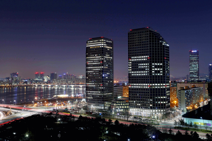 位于首尔市汝矣岛的双峰塔全景。大楼上正放着LG智能手机G6的灯箱广告。