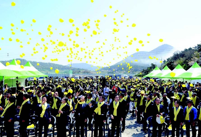 在全罗南道珍岛彭木港举行的世越号(岁月号)沉船事故三周年追悼仪式上,参加者们放飞追悼气球。ⓒ news1