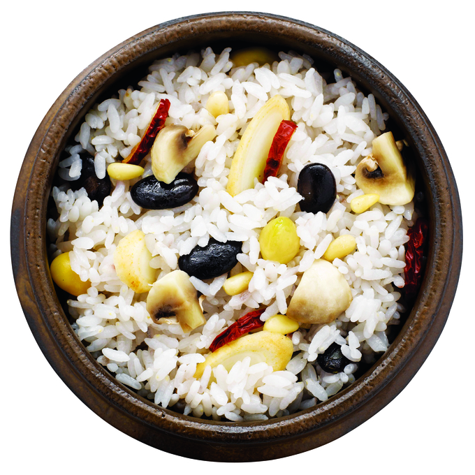 3. 石锅里放入浸好的糯米和大米,加入栗子、大枣、人参煮制,做好饭后配上调味酱即可。