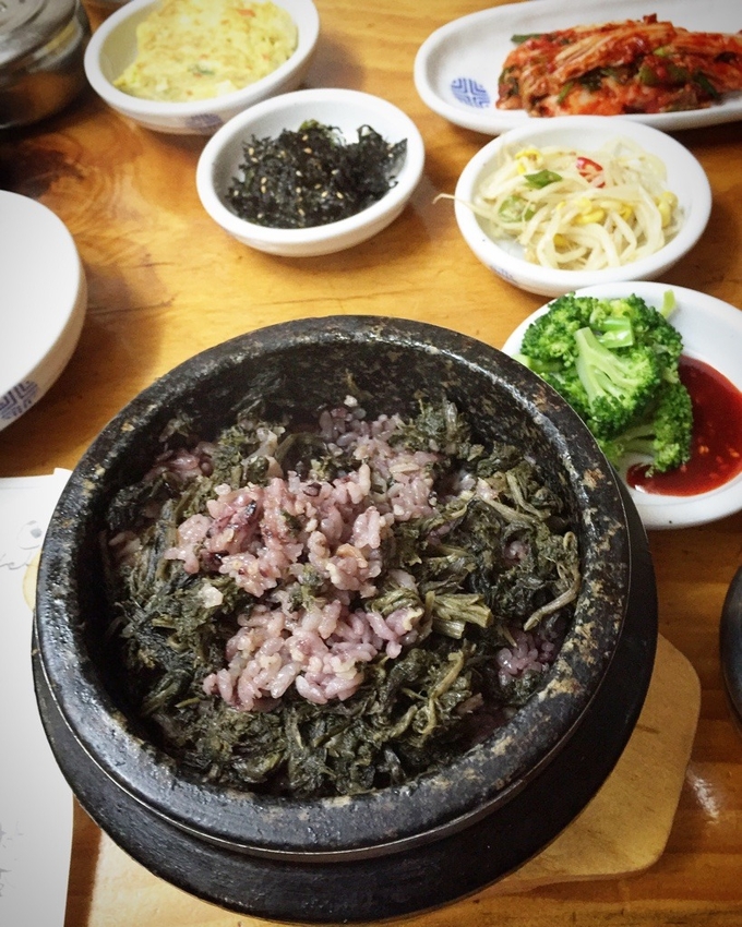 在石锅中烹煮米饭后,均匀放入各种颜色的野菜和各种食材的石锅拌饭,不需要特别的小菜,也可以当成一顿饭食用,也是一个各种野菜和肉相结合的营养平衡的极品料理。