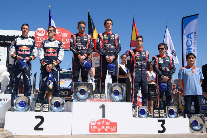 2017 世界汽车拉力赛(WRC) 法国科西嘉岛拉力赛中获得第一名和第三名的现代车队。第一名Thierry Neuville和Nicolas Gilsoul),第三名Dani Sordo和Marc Marti。