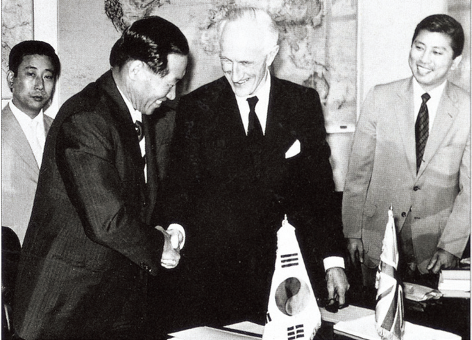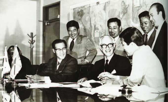 1971年与英国朗巴顿会长为建设造船所而引进贷款达成协议,在合同上签字后满脸笑容的已故现代创始人郑周永会长。