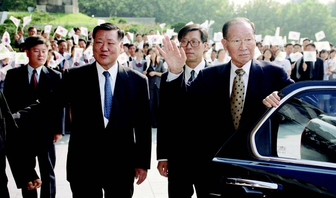 现代集团名誉会长(故)郑周永(右边)、现任现代汽车集团会长郑梦九(左边)以及前任现代集团会长郑梦宪(继郑周永会长)。1999.09.28