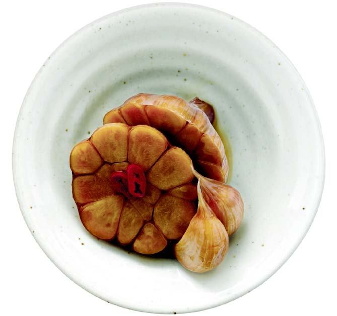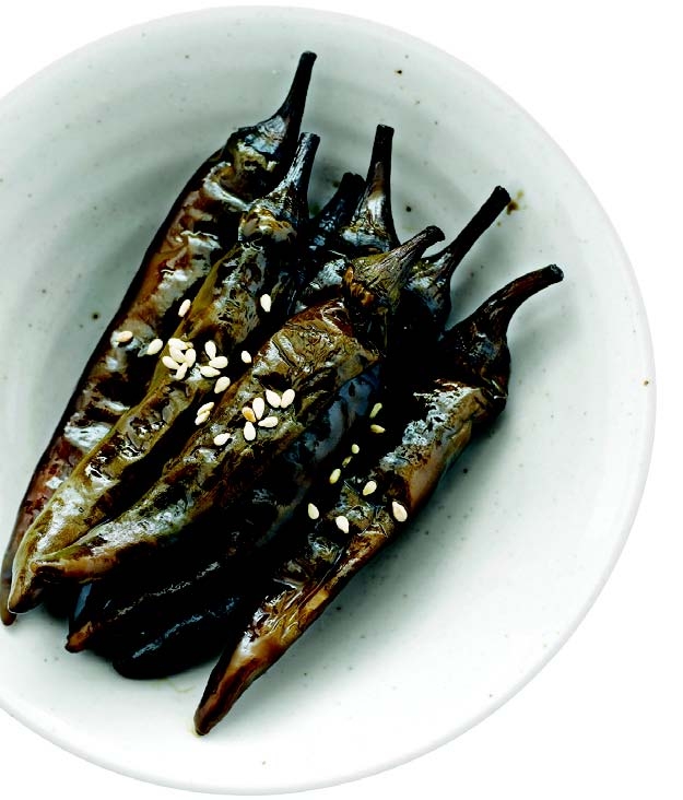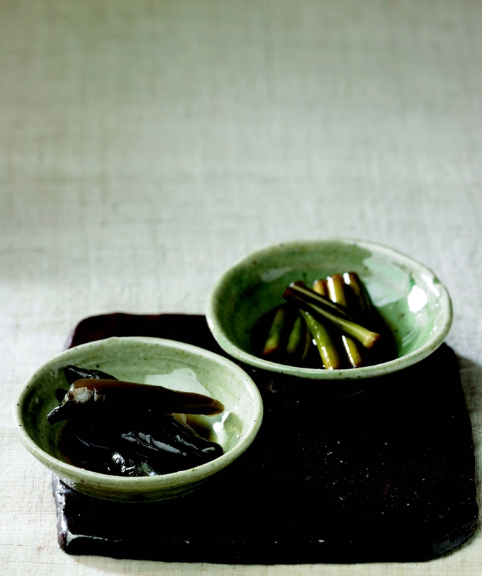 酱菜根据蔬菜的种类,配以不同的酱腌制。制作大蒜酱菜,将当年产的大蒜放入食用醋中浸泡,去辣味后,倒入酱油和白糖腌制。如果用盐水代替酱油,可使腌制的大蒜亮白剔透。一颗大蒜横切下去,切面犹如一朵盛开的花,取出一颗颗蒜粒品尝,酸脆的口感别具一格。辣椒叶酱菜、茄子酱菜或苏子叶酱菜的制作方法大致相同,而蒜苔或黄瓜用辣椒酱腌制则更美味。使用大酱或辣椒酱腌制时,可先将蔬菜晒干至发蔫后使用。取出食用前,先把辣椒酱刮掉,切成小块,加上白糖和芝麻油搅拌着吃。秋天使用大酱腌制后,到了春天取出食用的大酱苏子叶酱菜,不仅会让我们精神百倍,也是一个增加食欲的美食。