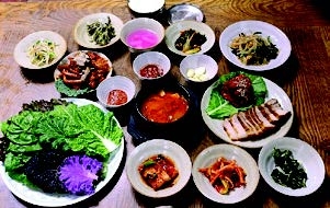 首尔论岘洞的元祖包饭店是尤其受老外欢迎的美食店。包括薄切五花肉在内的30余种不同种类的包饭蔬菜,就是这家店门庭若市的秘诀。蔬菜和其他小菜可以无限续。独家配制的海鲜包饭酱,可助食客享受进一步升级的包饭味道 。生菜、白菜嫩叶、南瓜叶、海带、神仙草等种类多样的蔬菜,与切得薄如纸张的五花肉搭配,可谓是天上美味。酸酸辣辣的凉拌葱丝也是别有风味。做包饭时加点小菜炖青花鱼也不错。这里提供的丰盛的一桌菜,可使食客得到五官的满足。
