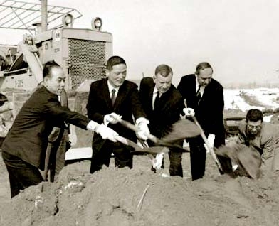 韩华集团创始人(故)玄岩金锺喜会长(图左二)参加京仁能源开工典礼,铲了第一锹土。
