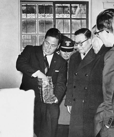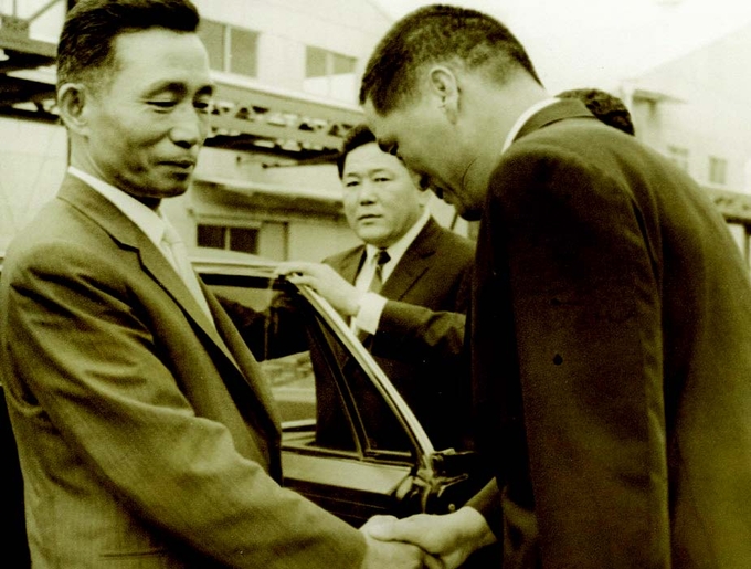 朴正熙总统与(故)玄岩金锺喜会长打招呼。