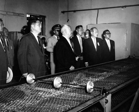 1959年7月27日,访问仁川工厂的李承晚总统(图中),视察工厂现况。(第一排的最左边就是(故)玄岩金锺喜会长)