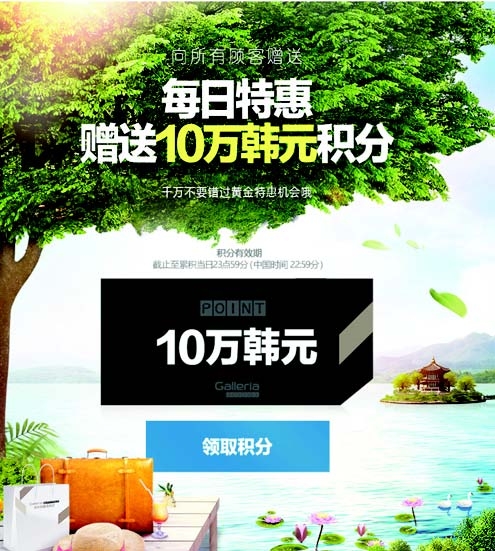 2. 2017年6月21日至7月31日,格乐丽雅网上免税店开展每日特惠活动,每日向所有顾客赠送10万韩元积分,现金积分可直接使用,积分累计有效期截止至当日23点59分。