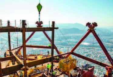 乐天世界塔上层部分正在设置的斜勒构架(没有柱子支撑重量的技术)