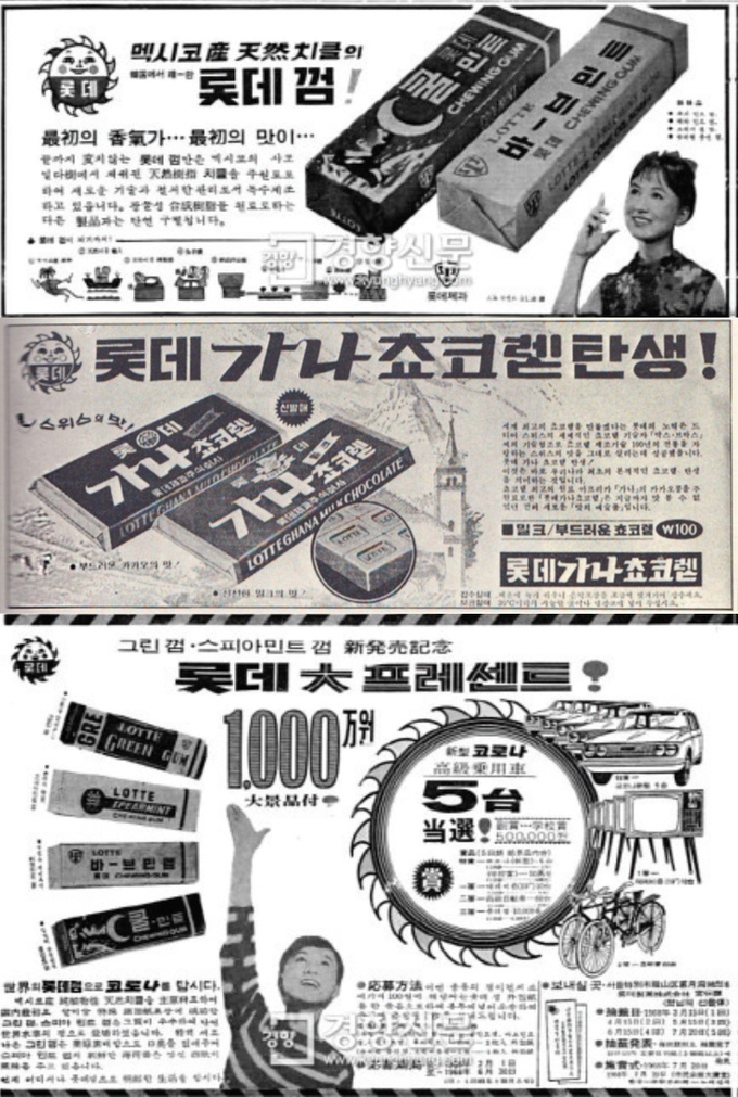 早期乐天口香糖与乐天巧克力的新闻广告。