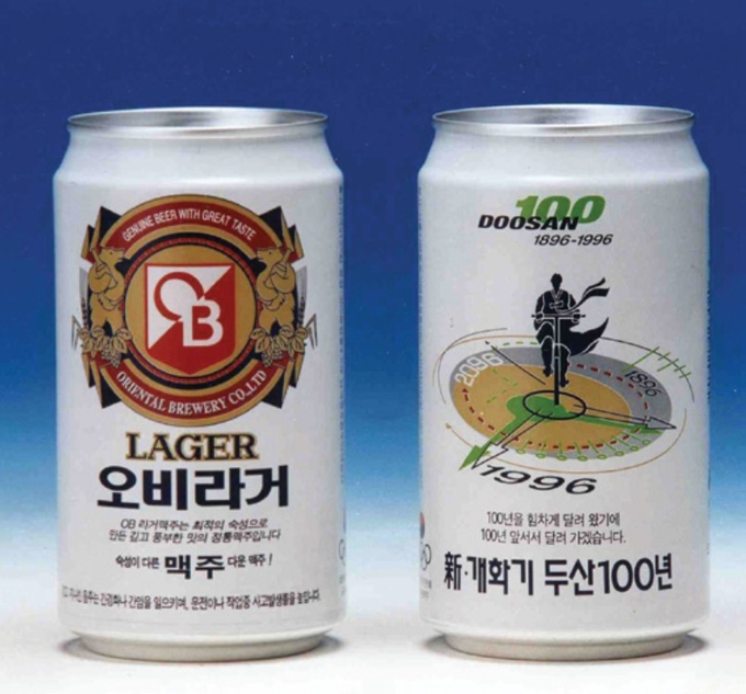 为纪念斗山集团创业100周年,OB啤酒推出带有“斗山集团100年”字样的听装啤酒。