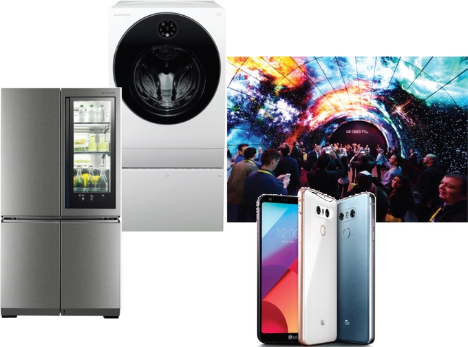 从左往右依次是SIGNATURE洗衣机、SIGNATURE冰箱、OLED电视、smart phone G6。