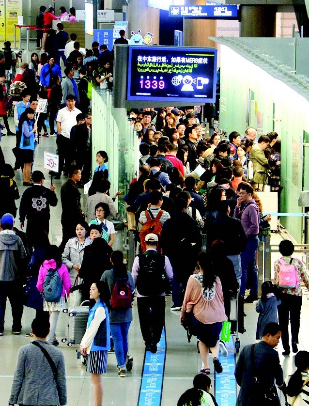 仁川国际机场出境大厅出国旅游的人群熙熙攘攘。