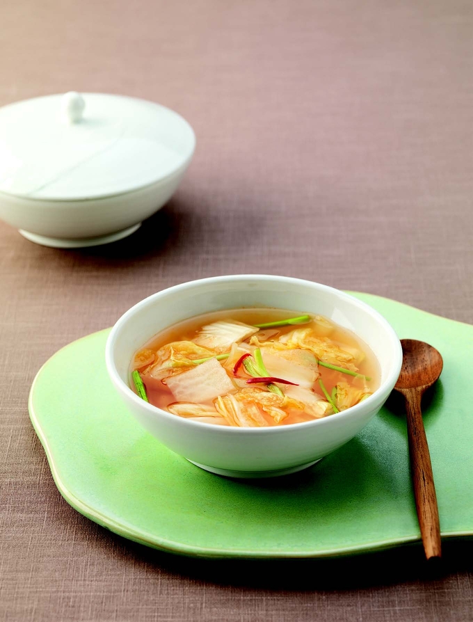 白菜 200g、萝卜 200g、盐 10g(2½小匙)、小葱 20g、水芹菜 50g、大蒜 20g、生姜 10g、红辣椒 30g(1½个)、松仁 3.5g(1小匙)、泡菜汤汁:水1.2kg(6杯)、盐 18g(1½大匙)、糖 4g(1小匙)、辣椒粉 14g(2大匙)