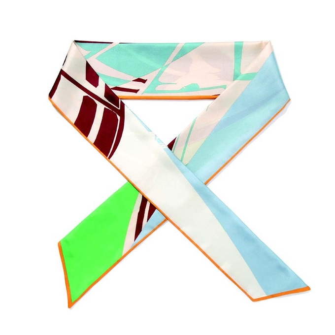 以100%丝绸材料制作的一条多色彩窄丝巾,拥有特有的高档光泽。由于前后都有多个彩色图案,所以很容易演绎出帅气的装扮。有绿色、珊瑚色两种颜色。