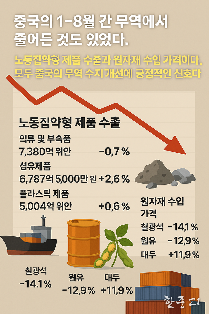 중국의 1~8월 간 무역에서 줄어든 것도 있었다. 노동집약형 제품 수출과 원자재 수입 가격이다. 모두 중국의 무역 수지 개선에 긍정적인 신호다.
